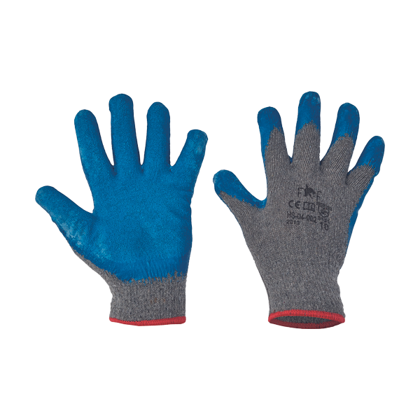 Knitted seamless gloves made of cotton/polyester blend, latex dipped, wi anti-slip finish on palm and fingers.
