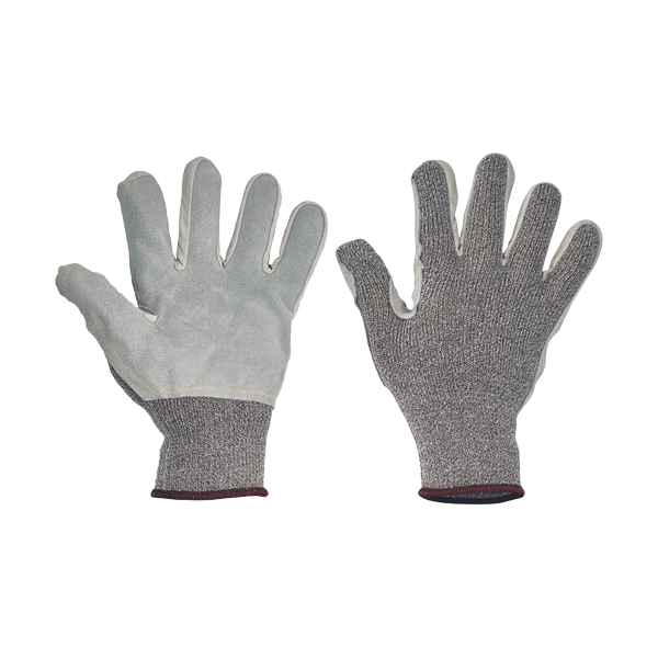 Knitted seamless gloves from glass fibre, Spandex and nylon, with cowsplit leather reinforced palm and fingers, cut resistance level E.