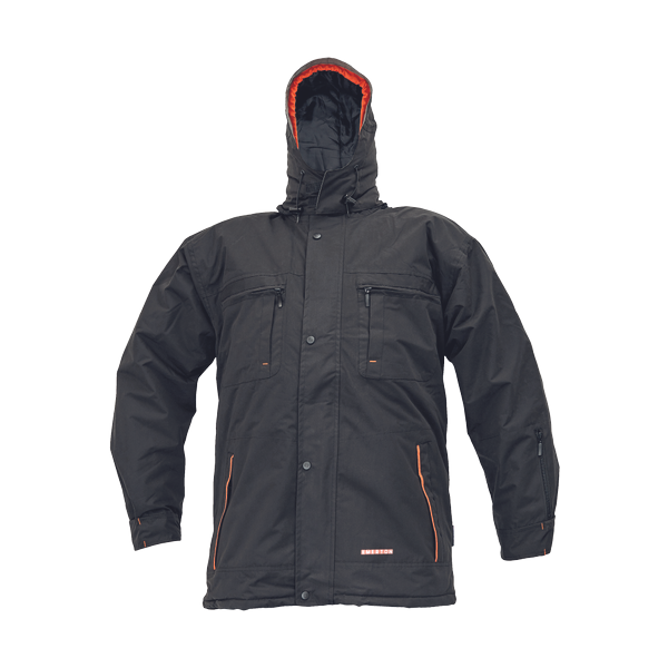 winter workwear longer cut jacket, zipper closure with placket cover; wind and water resistant; detachable insulated hood; 2 front zipper pockets, 2 chest zipper pockets; velcro adjustable cuffs; rubber adjustable bottom hem.