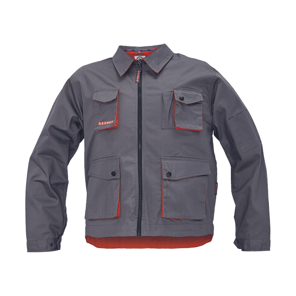 workwear jacket with zipper closure; 2 big front pockets with popper closure; 2 chest pockets; popper adjustment of sleeve width.