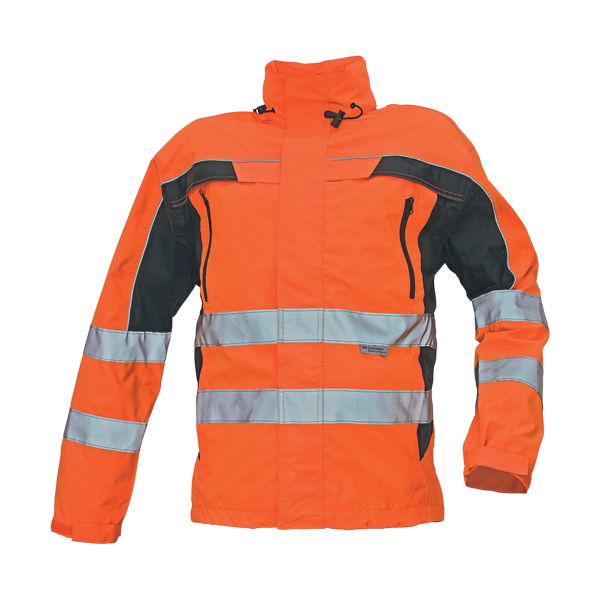 men's HI-VIS waterproof jacket with integrated hood in a collar and lining; reflective stripes around hips and sleeves; sealed seams, water resistance and wapour permeability; 2 side pockerts, 2 chest pockets; velcro sleeve rims adjustment.