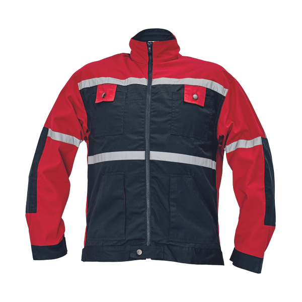men's working jacket with stand up collar and zipper closure; oil and water resistant impregnation; 2 front pockets, 2 chest pockets with popper closure; elbow parts reinforcement; reflective stripes; waist adjustment with popper tightening belt.