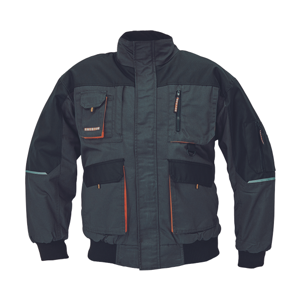 winter stylish pilot jacket with zipper closure covered by velcro placket, wind resistant; polyester reinforcement Oxford 600D on sh oulders; 2 front pockets with flap, 2 chest pockets; 1 extra pocket for cell phone; 1 left sleeve pocket; reflective elements; elastic ribbed knitted welt on cuffs and bottom hem of the jacket.