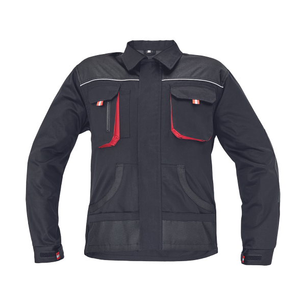men´s working jacket; zipper closing covered with velcro placket; 2 breast pockets with velcro closing; 2 multifunctional side pockets; polyester Oxford reinforced elbow parts and shoulders.