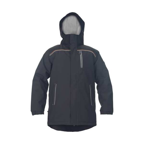 winter padded jacket with detachable hood; TPU membrane; extended back part; reinforced shoulders; 1 chest pocket with zipper in contrast HI-VIS colour; 2 side pockets, 2 closable inside pockets; adjustable bottom by draw string; saddle and pockets lined with reflective piping; decorative stitching in contrast HI-VIS colour; input for embroidery or print.
