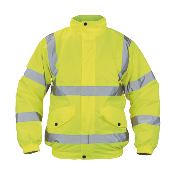 men's HI-VIS waterproof padded winter pilot jacket with integrated hood; reflective stripes across shoulders, around chest, hips and sleeves; 2 side flap pockets, 1 inner pocket; elastic sleeve and bottom hems; placket covered zipper closure.