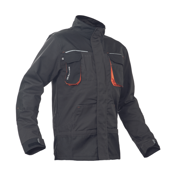 men's working jacket, zipper closure with velcro cover; Oxford 600D reinforced elbow parts; 2 side pockets, 2 chest pockets; 1 e-secure phone pocket; reflective details; contrast color of bartacks.