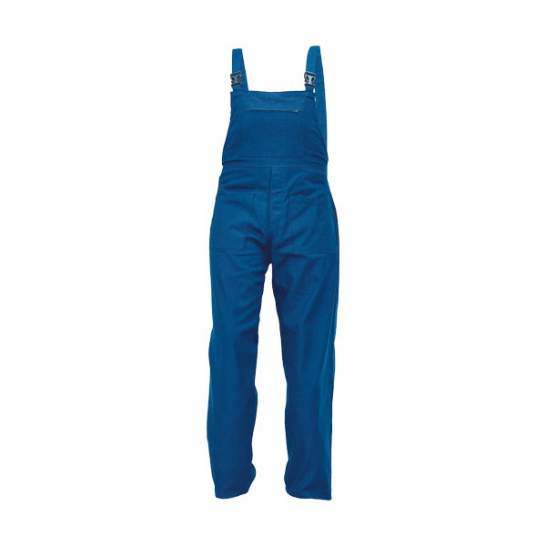 men's working bib pants; 2 side pockets, 2 back pockets; 1 chest pocket with zipper closure; braces with plastic buckles.