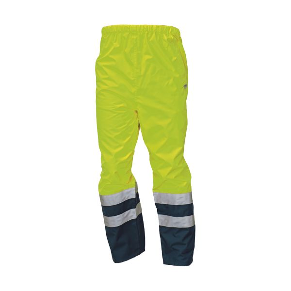 men's lightweight HI-VIS pants with 3M reflective strips around bottom legs, taped seams; high water resistance, permeable; adjustable leg bottom hems with plastic press studs.
