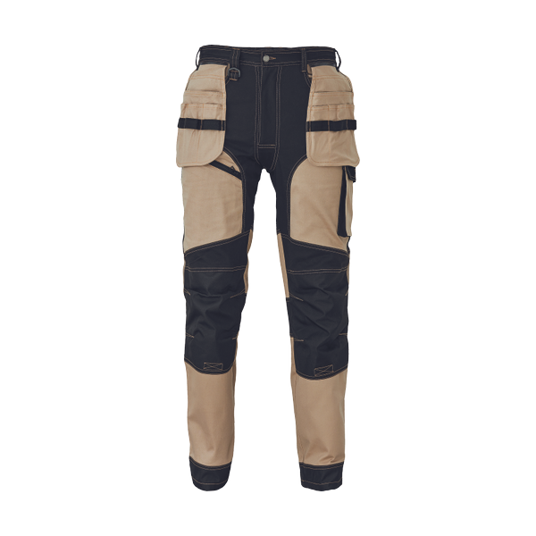men's working pants from elastic waist; 2 side pockets, with 2 flying tool pockets in front; "D" ring; 1 side leg pockets with flap; 1 side zipper pocket; 2 flap pockets on the back; reinforced knee parts with input for knee pads; extendable length of legs of 5 cm; reinforced back part of bottom leg; decorative stitching; 265 g/m2