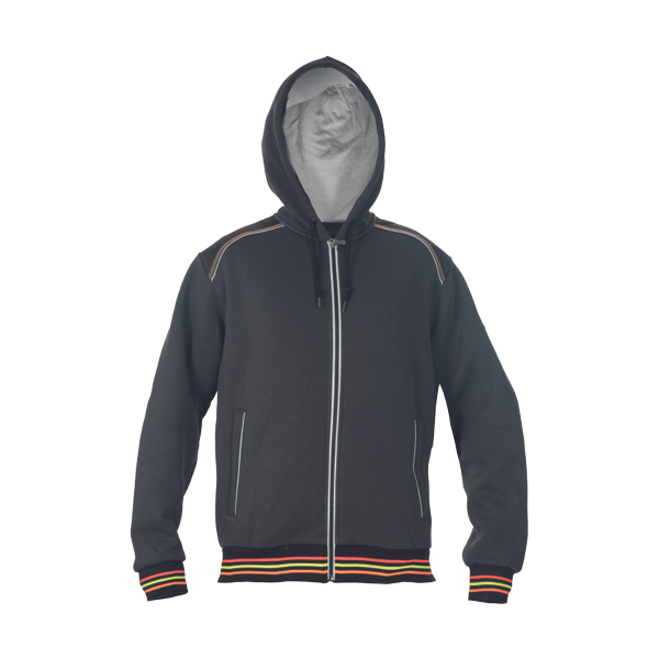 zipper hoodie from cotton and polyester mix, french terry non-brushed inside; reinforced shoulders and elbow parts; saddle and side pockets lined with reflective piping; double layer hood with HI-VIS lining matching the zipper and decorative stitching colour; elastic hems on the sleeves and bottom.