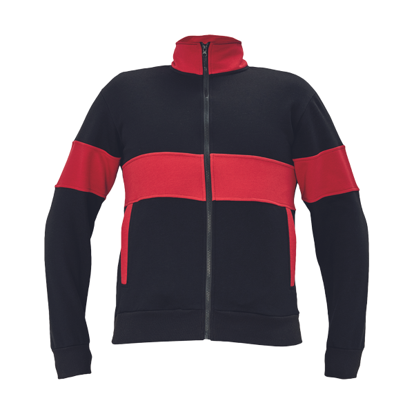 men's zipper sweatshirt with stand up collar from mix cotton and polyester french terry - non brushed; 2 side pockets bordered with contrast fabric; elastic hems from ribbed knitted fabric at sleeves and bottom; contrast chest and sleeve part.