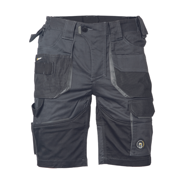 men's working shorts with elastic waist; elastic inovative fabric TRIFIBETEX®; durable tripple stitching of legs and crotch; spacious multifunctional front pockets with tool strap; reflective details tone in tone.