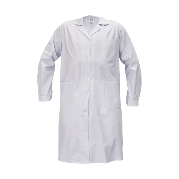 lady's long sleeve cotton work coat; sleeves with buttons; 3 pockets, loose back belt.