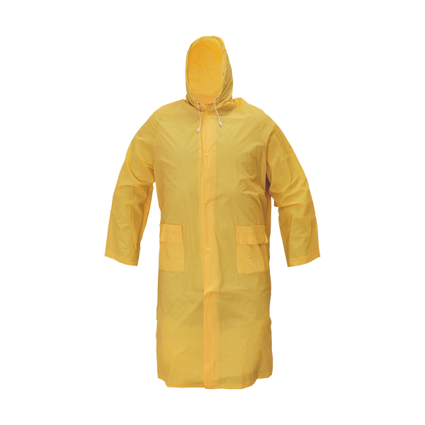 prolonged waterproof protective coat with a hood; soft and lightwieght PVC, taped seams; 2 front flap pockets; sleeve hems popper adjustment; underarm and back side ventilation.