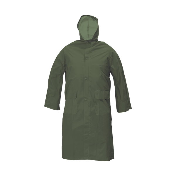 prolonged waterproof ¾ coat with a hood, taped seams; PVC coating; 2 front flap pockets; inner rubber hem; underarm and back side ve ntilation; practical package.