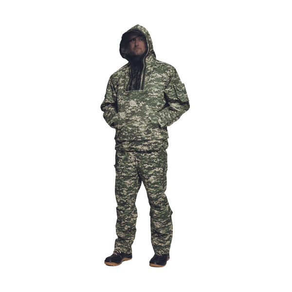 special suit developed for mites, mosquitos, midges, ticks and other insects protection; tightly fitted inner cuffs and bottom leg hems; 1 front kangaroo pocket; 1 left sleeve pocket; face protective net should be folded into a chest pocket.