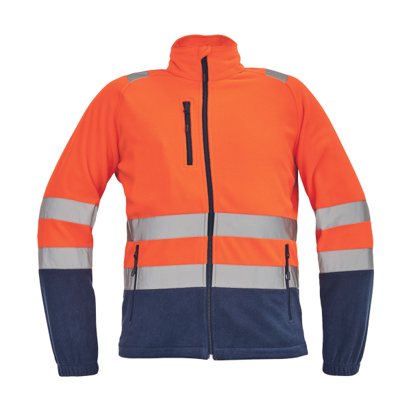 men's HI-VIS fleece jacket with reflective stripes across shoulders and around sleeves and hip part; zip fastening; 1 chest and 2 side zipper pockets; elastic sleeve hem and draw string in the bottom.