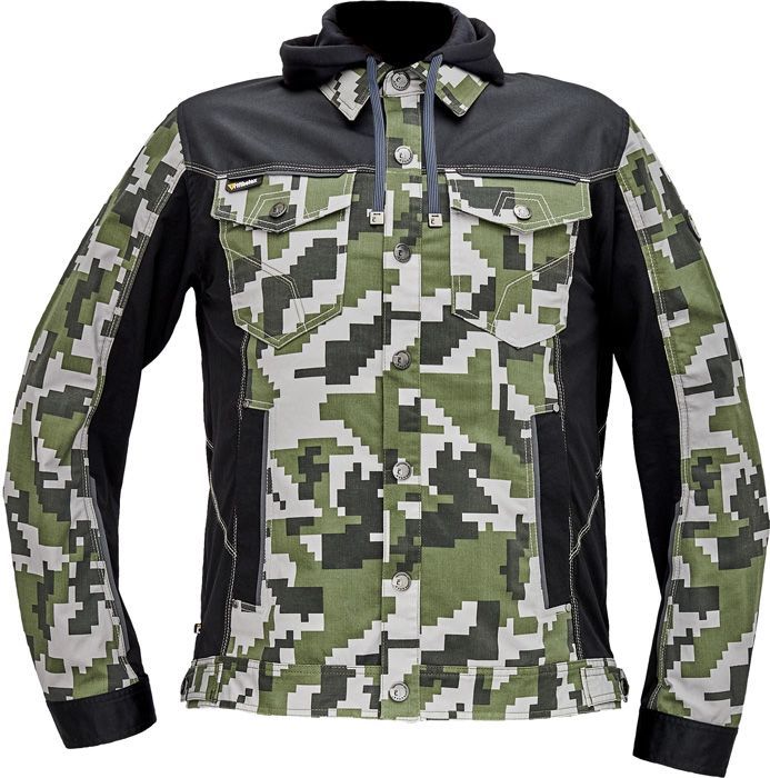 men's working jacket with detachable hood and metal poppers in trendy camou print; elastic inovative fabric TRIFIBETEX® in combination with four way stretch nylon TRIFIBETEXPRO®; tripple stitching, CORDURA shoulder reinforcement; 2 side pockets, 2 chest jeans pockets; adjustable sleeves with poppers; reflective details tone in tone.