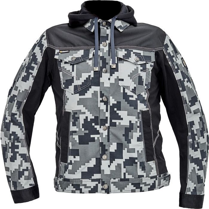 men's working jacket with detachable hood and metal poppers in trendy camou print; elastic inovative fabric TRIFIBETEX® in combination with four way stretch nylon TRIFIBETEXPRO®; tripple stitching, CORDURA shoulder reinforcement; 2 side pockets, 2 chest jeans pockets; adjustable sleeves with poppers; reflective details tone in tone.