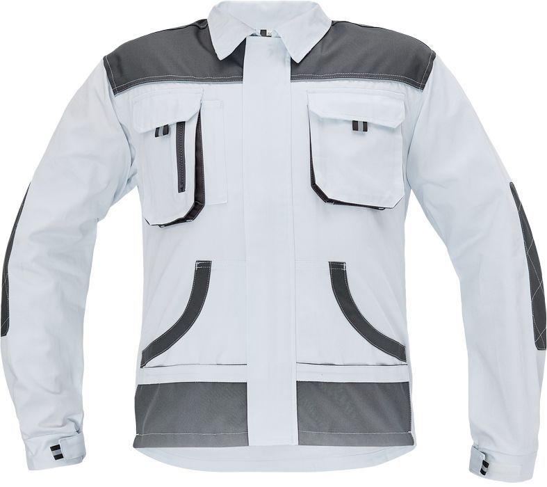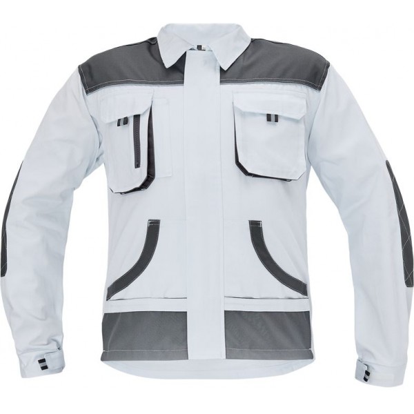 men's working cotton jacket; zipper closing covered with velcro placket; 2 breast pockets with velcro closing; 2 multifunctional side pockets; polyester Oxford reinforced elbow parts and shoulders.