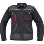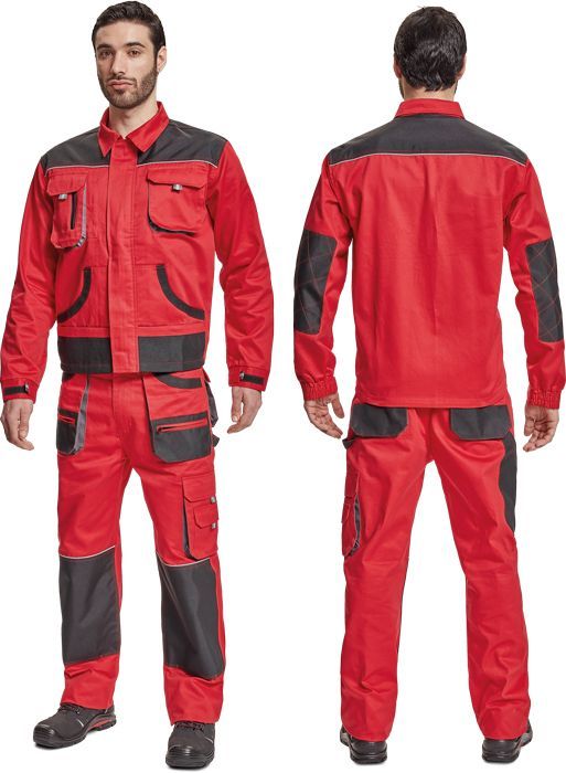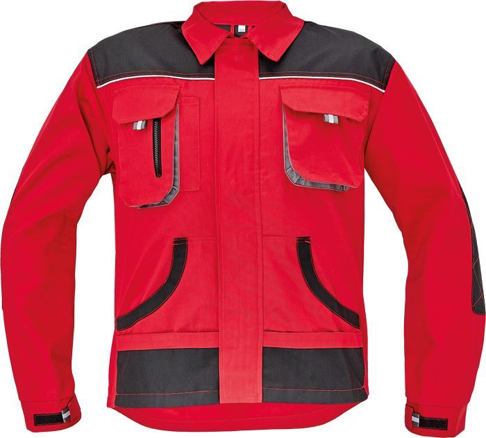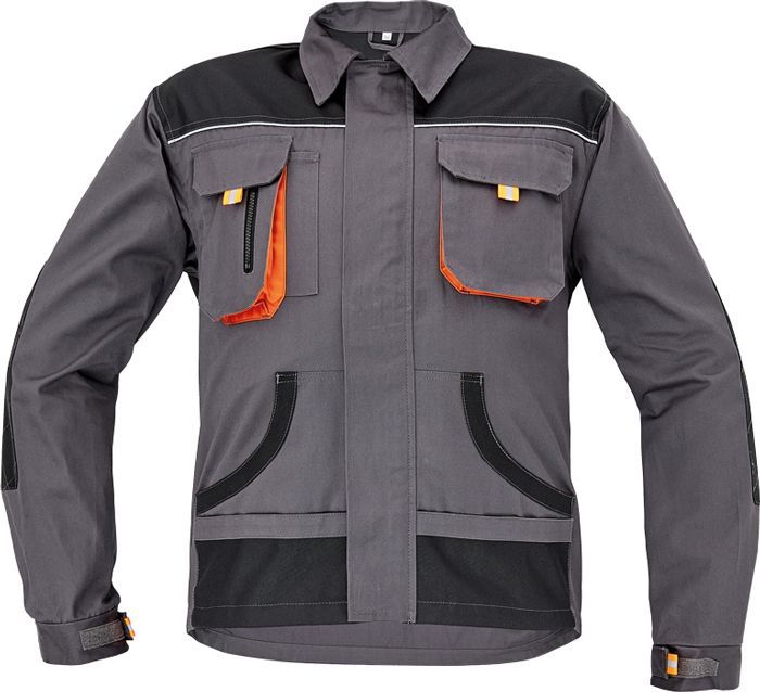 men's working cotton jacket; zipper closing covered with velcro placket; 2 breast pockets with velcro closing; 2 multifunctional side pockets; polyester Oxford reinforced elbow parts and shoulders.