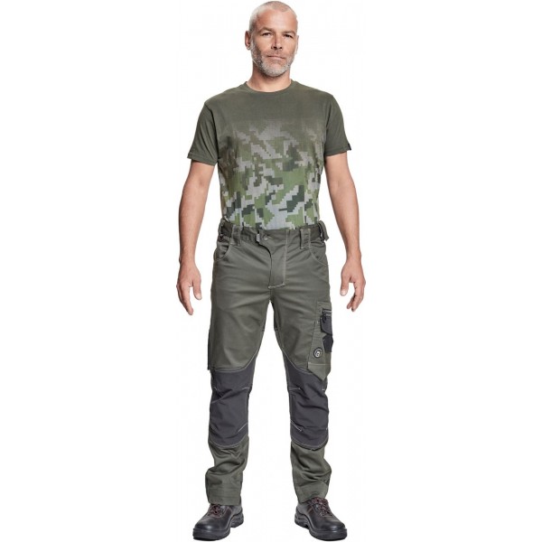men's working pants with elastic waist; elastic inovative TRIFIBETEX® material; durable tripple stitching of legs and crotch; CORDURA reinforcements at knee parts; spacious multifunctional front pockets with tool straps; reflective details tone in tone; extendable length of legs.