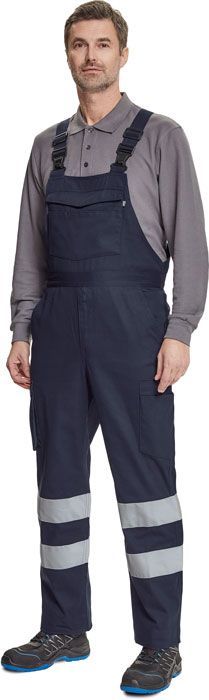 men's working lightweight bib pants with reflective stripes; elastic part on the back side; 2 side pockets, 1 coins pocket; 2 multifunctional thigh pockets, 2 back pockets; 1 big multifunctional bip pocket; elastic braces with plactic buckle; extendable length of legs; Note: colours 20, 50, 16, 60 are only to order after contact our PPE consultant.