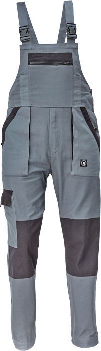 men´s working bib pants with elastic waist; wide braces with plastic buckles; 2 side pockets, 1 thigh pocket; 1 big chest pocket, 2 back pockets; knee parts reinforcement; extendable leg length.