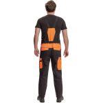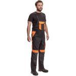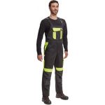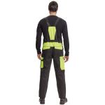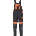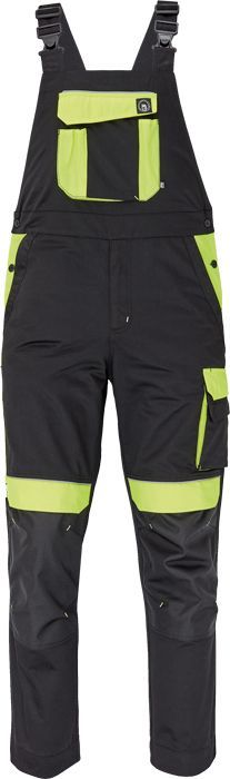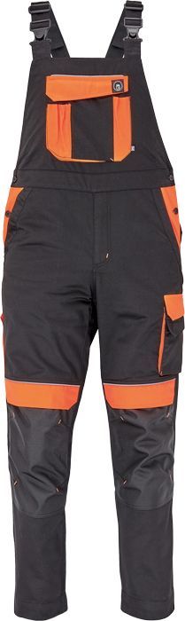 men's working bib pants with elastic waist; wide braces with plastic buckles; 2 side pockets, 1 double left thigh pocket; 1 big chest pocket, 2 back pockets, 2 small back pockets on right thigh; reflective piping; Oxford 600D knee parts reinforcement with flap pockets for knee pads insertion; extendable length of legs.