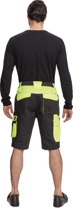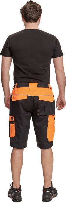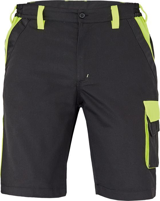 men's working shorts with elastic waist; 2 side pockets, 2 back pockets; reflective piping.