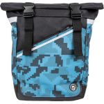 spacious 1 room backpack in trendy camouflage print; inside organizer for laptop, phone and wallet; padded back part and shoulder straps, unique roll up closing with 2 buckles.