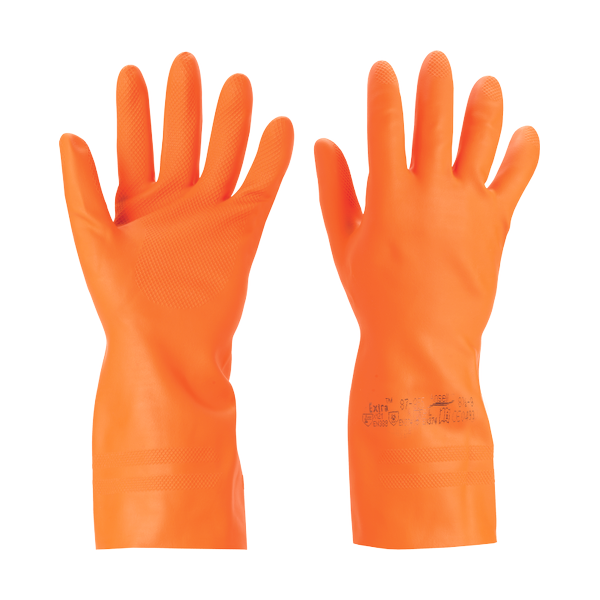 Chlorinated gloves made from 100 % natural 0,75 mm thick latex with no filler, with velour finish inside, relief surface in palm and fingers, total length 32 cm.