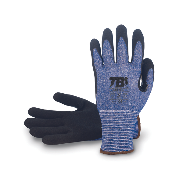 blue seamless HDPC gloves with glass fibre and nylon dipped in micro-finish nitrile on palm