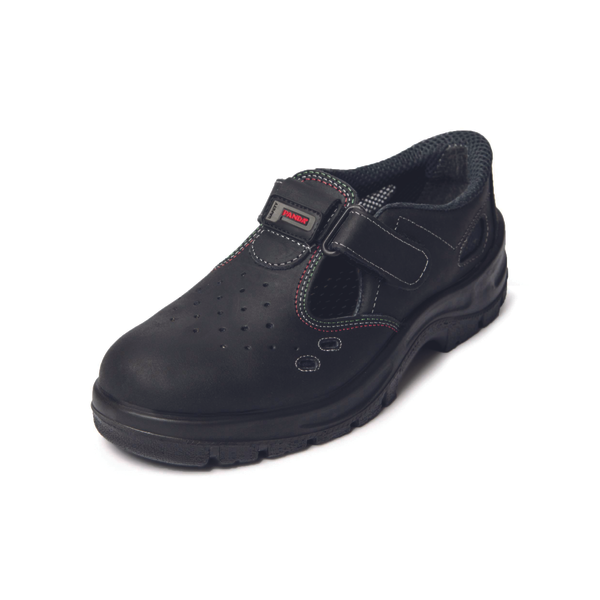 Safety sandals without steel toe cap with antistatic, antislip and fuel resistant sole, energy absorption in heel and breathable leather upper.