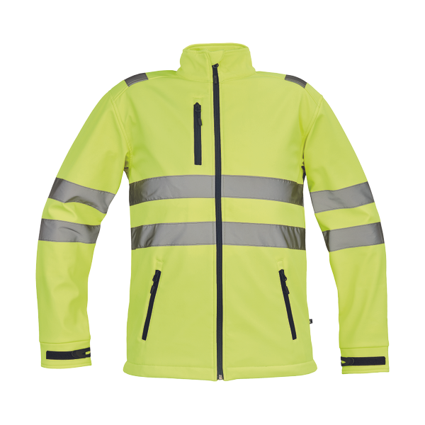 men's fully HI-VIS sofsthell jacket with breathable TPU water resistant membrane; reflective stripes across shoulders and around sleeves and hip part; zip fastening; 1 chest and 2 side zipper pockets; velcro sleeve closing and draw string in the bottom.