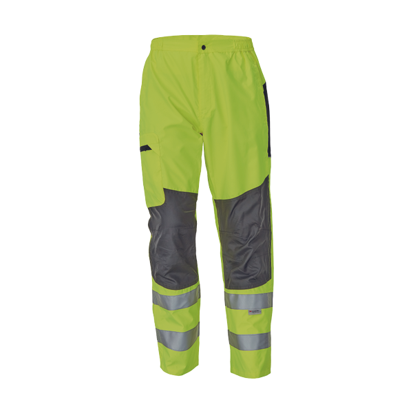 men's waterproof HI-VIS pants with reflective stripes under knees; sealed seams, permeable; adjusted waist with velcro; bottom legs rims with zipper slits; knee and seat part reinforcement.