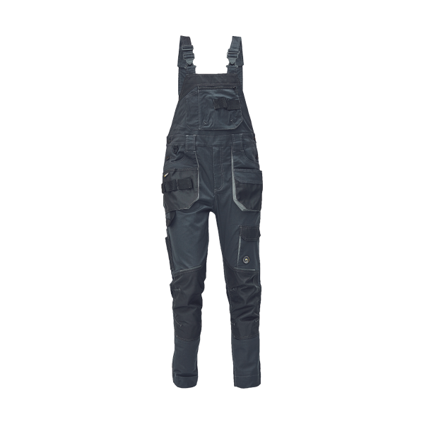 men's working bib pants; elastic inovative fabric TRIFIBETEX®; elastic waist, durable tripple stitching of legs and crotch; Oxford 600D reinforced knee parts with input for knee pads; spacious multifunctional front pockets with tool strap; reflective details tone in tone; extendable lenght of legs.