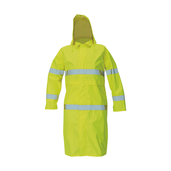 men's lightweight HI-VIS waterproof coat with an integrated hood and reflective stripes; high water resistance, permeable; 2 front pockets with flaps; underarms and back ventilation; taped seams.