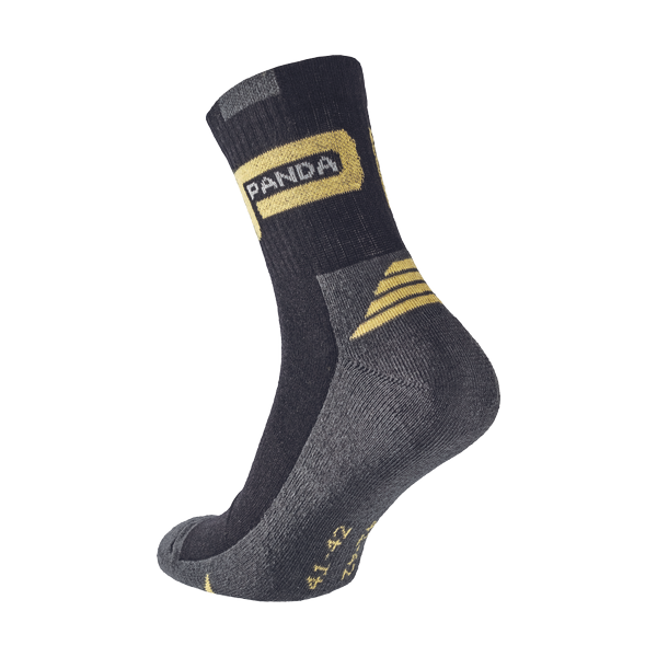 special socks designed for demanding work environment have been developed using the latest technologies in production and by a combination of specially treated fibers; high working comfort; unconstricting hem; foot protection during extreme workload; ideal perspiration escape; perfect thermal insulation; very fine sewing of toes; elastic bandage to prevent shifting of the sock in the shoe; padded zones to protect the foot against pressure sores and blisters; venting channels ensure an ideal climate even at extreme loads.