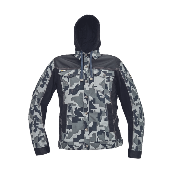 men's working jacket with detachable hood and metal poppers in trendy camou print; elastic inovative fabric TRIFIBETEX® in combination with four way stretch nylon TRIFIBETEXPRO®; tripple stitching, CORDURA shoulder reinforcement; 2 side pockets, 2 chest jeans pockets; adjustable sleeves with poppers; reflective details tone in tone.