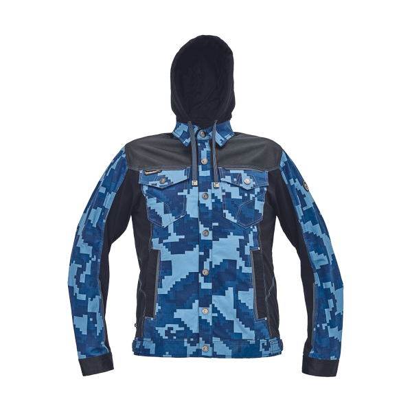 men's working jacket with detachable hood and metal poppers in trendy camou print; elastic inovative fabric TRIFIBETEX® in combination with four way stretch nylon TRIFIBETEXPRO®; tripple stitching, CORDURA shoulder reinforcement; 2 side pockets, 2 chest jeans pockets; adjustable sleeves with poppers; reflective details tone in tone.