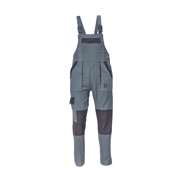 men´s working bib pants with elastic waist; wide braces with plastic buckles; 2 side pockets, 1 thigh pocket; 1 big chest pocket, 2 back pockets; knee parts reinforcement; extendable leg length.