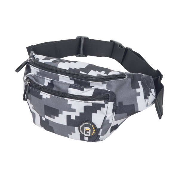 3 rooms waist bag in trendy camouflage print; 1 inside zipper closing pocket; durable extendable strap with plastic buckle closing.